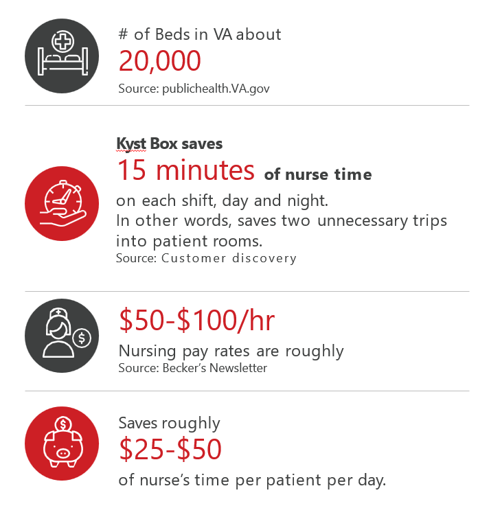 In a busy hospital setting, Kyst Box is a game-changer. By saving nurses 15 minutes per shift and reducing two unnecessary trips to patient rooms per shift, it significantly boosts efficiency and care. With potential daily savings of $250,000 to $500,000 and annual savings of $90 million to $180 million, Kyst Box helps hospitals streamline operations and maximize time and cost savings. Kyst Box ensures essentials, from dentures to earbuds and glasses, are perfectly organized, allowing nurses to focus more on patient well-being.